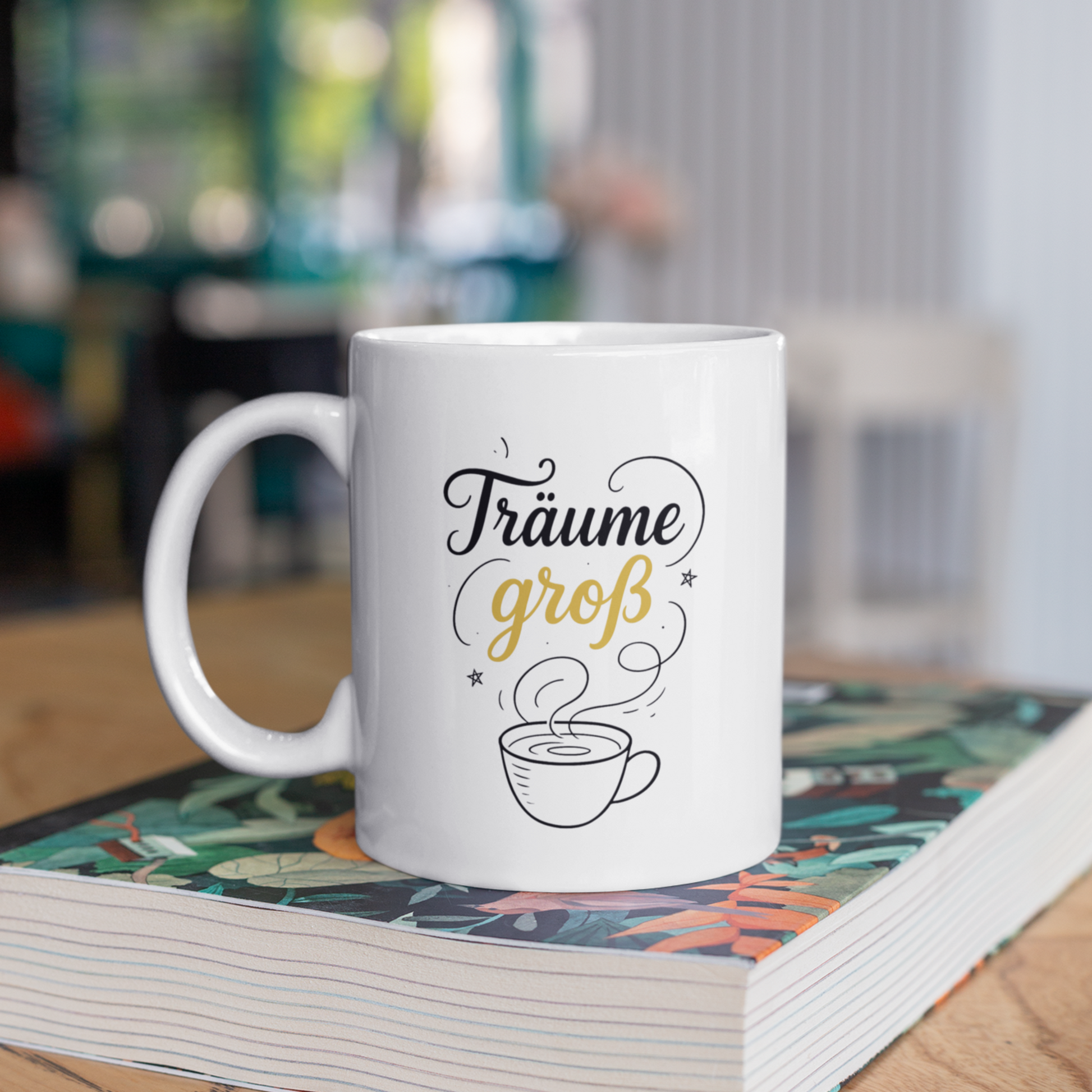 Die Tasse Träume groß inspiriert dich bei jedem Schluck, mutig zu träumen und das Leben voller Möglichkeiten zu genießen. 🌟 Mit elegantem Handlettering und goldenen Akzenten wird sie zum Lieblingsstück auf deinem Tisch. 💛